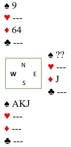 Nå kan altså ruteren testes først, og sparfinesse eventuelt tas som siste sjanse. Men vent litt... Når vi har resten av stikkene bortsett fra ett kan det oppstå en situasjon hvor det oppstår en skvis. Likevel, test ruteren først og "claim" tolv stikk om den sitter 3-3. Den sitter imdierltid 4-2 med fire kort hos øst som nå stopper fargen. La oss vente litt med den sparfinessen og ta hjerterstikkene, så tase resten av kløverstikkene. Hvor mange kort har det gått da? Det har ikke blitt spilt spar, men tre runder hjerter, tre runder ruter og fire runder kløver. Ti kort har gått, så alle spillerne har igjen tre kort. Hva vet vi om øst som kun har tre kort? Vi vet at der er det igjen en stor ruter, for hvis øst har kastet ruter står jo ruteren. Dermed vet vi også at øst har igjen eksakt to spar. Dette er igjen hos blindemann, hos øst som er den du vet mye om, og hos spillefører: