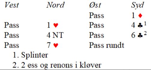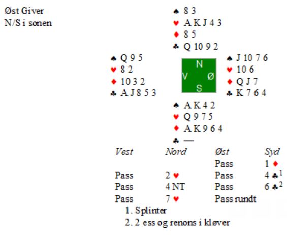 Av 21 bord var det bare 8 bord som var i slem. Per Egil og Jørgen gikk ut med et smell, og meldte som eneste par 7 hjerter. 4kløver viste singlteton/renons og gode kort. Da Per Egil bekreftet 2 ess og renons i kløver var Jørgen sikker på at det måtte være spill for 7 hjerter. Slik kortene satt var det 13 enkle stikk.