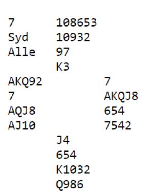 N/S vinner ganske enkelt 6 hjerter. Det er en glimrende slem selv om den ikke er helt sikker hvis det sitter ufordelaktig. Det verste utspillet er nok trumf. Da må det spilles litt forsiktig. Slik det sitter blir det imidlertid ingen problemer siden spar ess sitter foran K-Q. Sparen sitter dessuten 4-3 så det må nesten bli tolv stikk om en ikke roter seg helt bort.